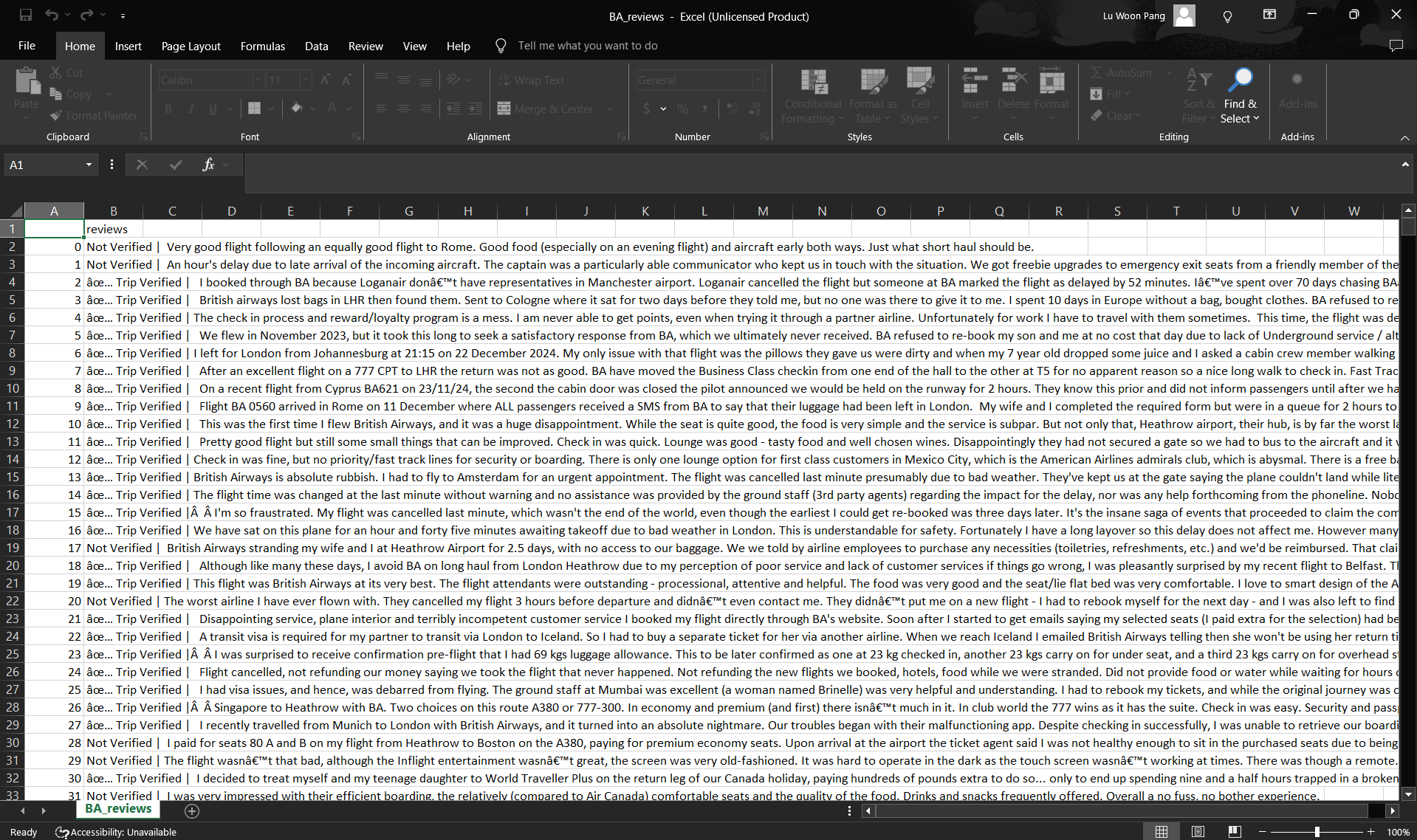 The initial CSV generated was unclean as the first column was not titled and the 'reviews' column was not formatted appropriately. Steps were taken to clean the CSV file. They include splitting text into columns, trimming whitespace, and creating data groups.