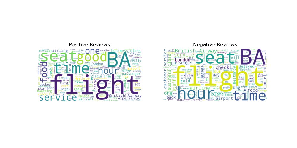 Two more word clouds were generated to find out the common words used in positive and negative reviews. For positive reviews, words that stand out include 'food', 'seat', 'time', and 'service'. For negative reviews, words that stand out are 'time', 'seat', 'luggage', 'customer service', and 'cancelled'.