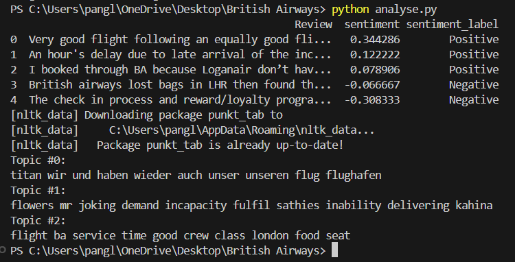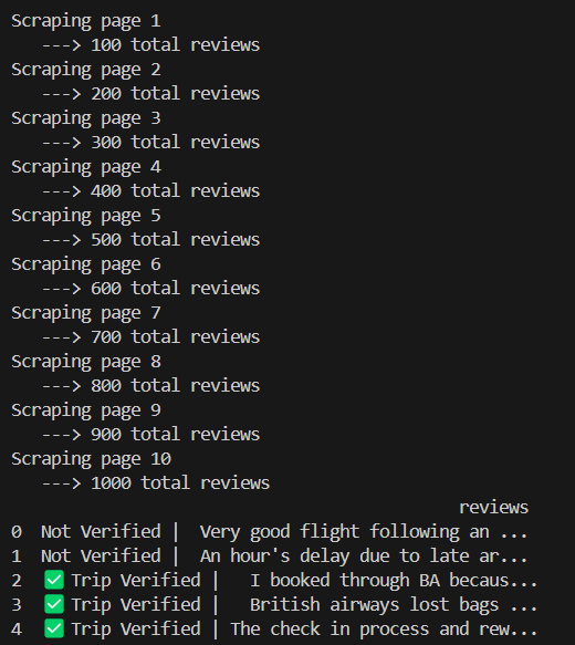 The first task was to scrape and collect customer feedback from a third-party source and analyse the data to uncover insights. The Beautiful Soup library was used to scrape reviews for British Airways from airlinequality.com.
