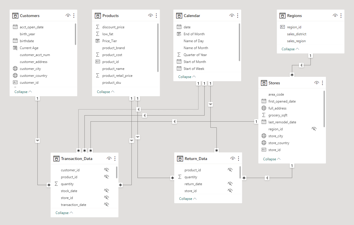 The data model created is shown below. The two data tables are connected to the lookup tables but not to each other. All relationships follow a one-to-many cardinality, with primary keys on the lookup side and foreign keys on the data side. Filters are all one-way, and the filter context flows downstream from lookup tables to data tables.